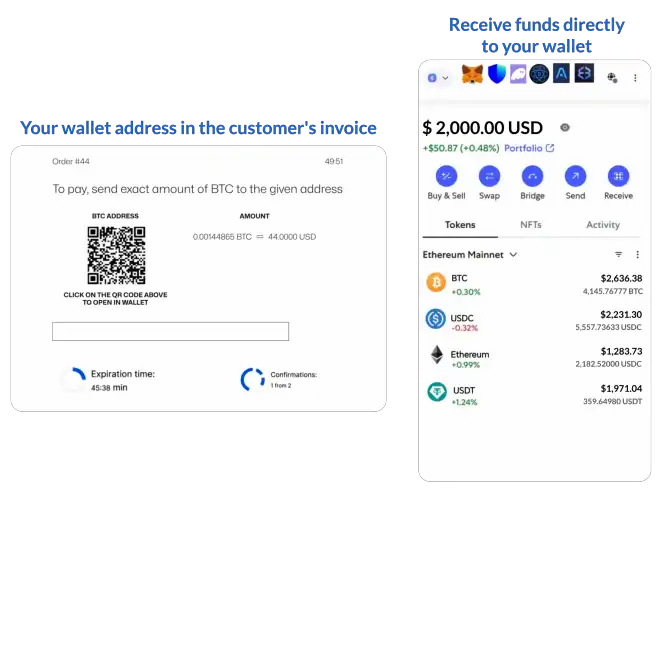 You can accept crypto payments on your website, online store, or application and receive funds directly to your hot wallet, cold storage wallet, or hardware wallet. You can use popular wallets such as MetaMask, Trust Wallet, Exodus, Electrum, Phantom, Coinbase Wallet, Ledger, Trezor, SafePal, Atomic Wallet, MyEtherWallet, and other wallets that provide a public address and are compatible with major blockchains.